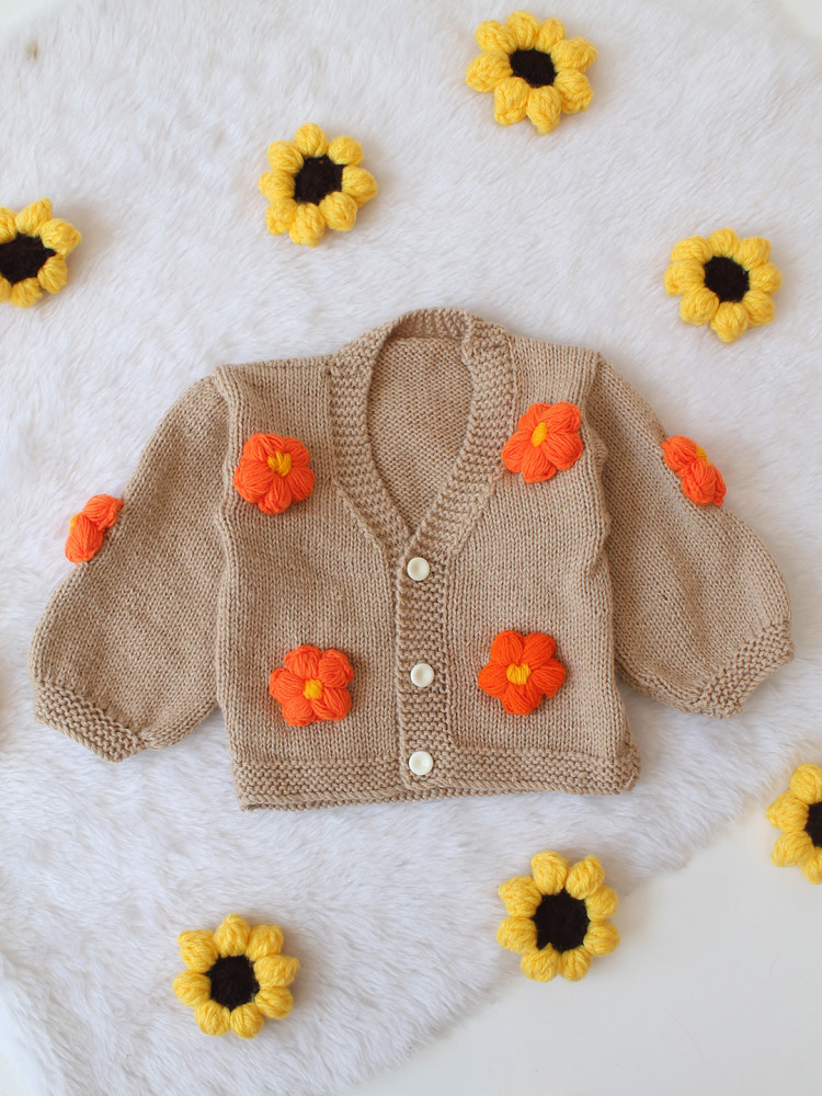 Handknitted floral applique sweater made with baby soft yarn, blending cozy comfort with elegant handcrafted florals.