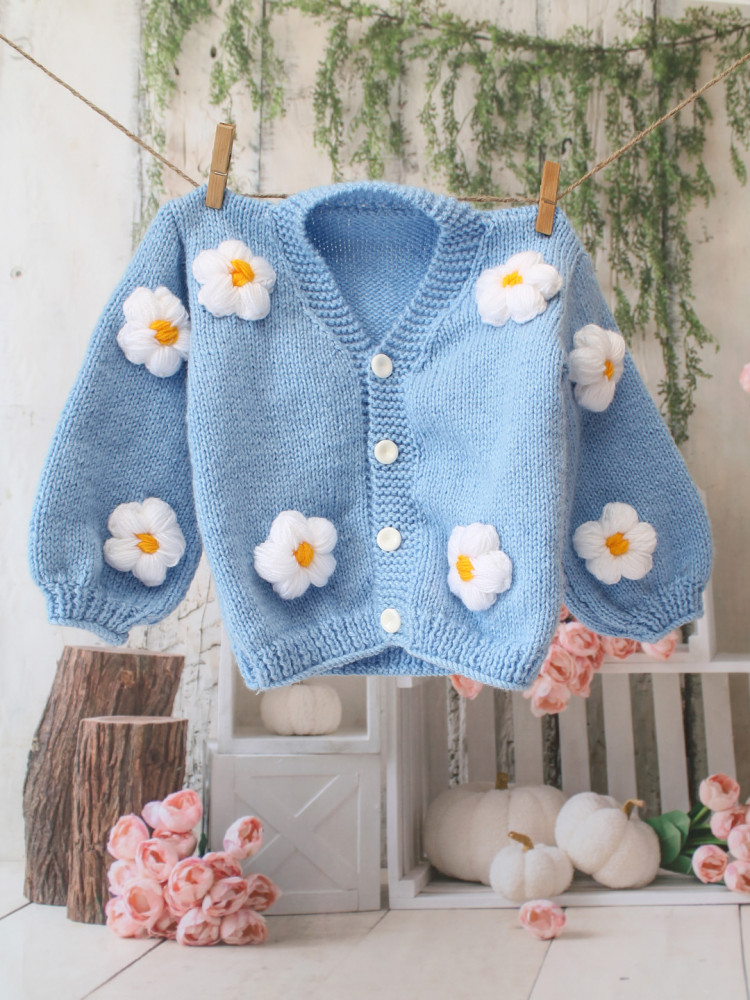Handknitted floral applique sweater made with baby soft yarn, blending cozy comfort with elegant handcrafted florals.