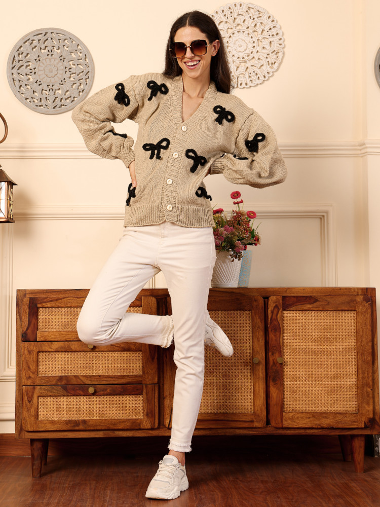 Crafted from soft, premium yarn, this handknitted black cardigan features charming bow appliques that add a touch of sophistication. Its versatile design makes it perfect for layering on cool days, combining comfort with a classic, handcrafted appeal. Ideal for both casual and dressy occasions.