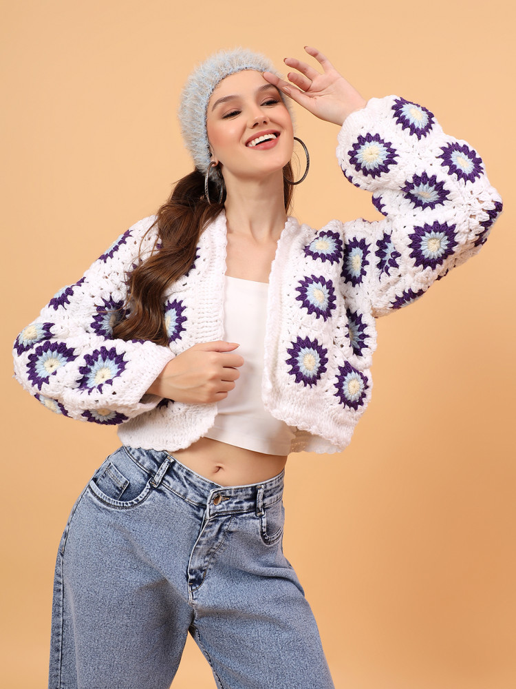 Handcrafted crochet granny square cardigan made with soft, premium yarn, featuring vibrant patterns and cozy comfort.