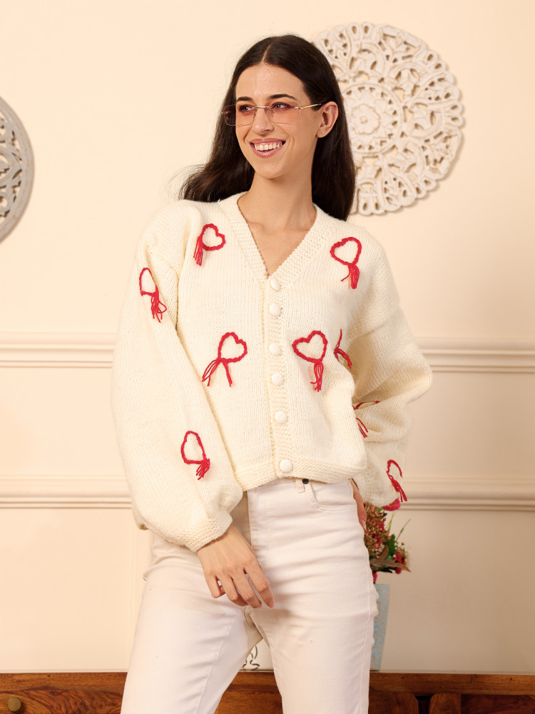 Red heart embroidered cardigan, handknitted with soft yarn, offering a charming and cozy look for everyday wear.